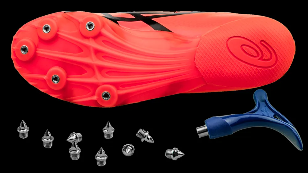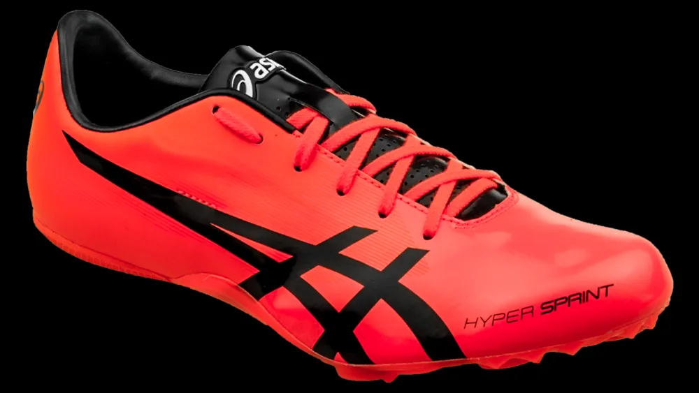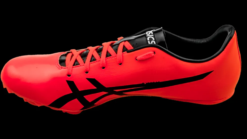 De Asics Hyper Sprint spike heeft een stijve plaat onderop en stevige hielkap.