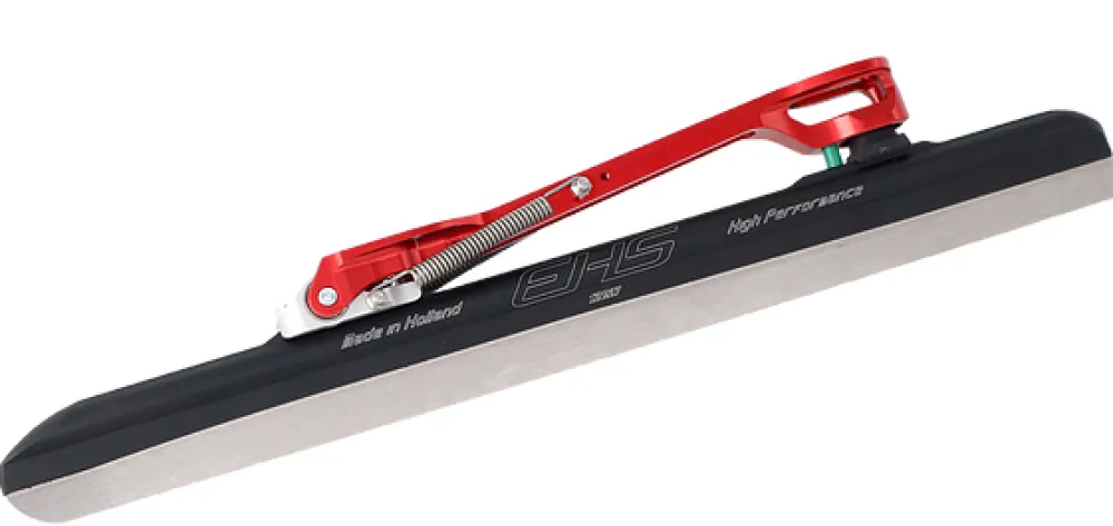 De nieuwste klapschaatsen worden enkel nog met rode beugel geleverd.